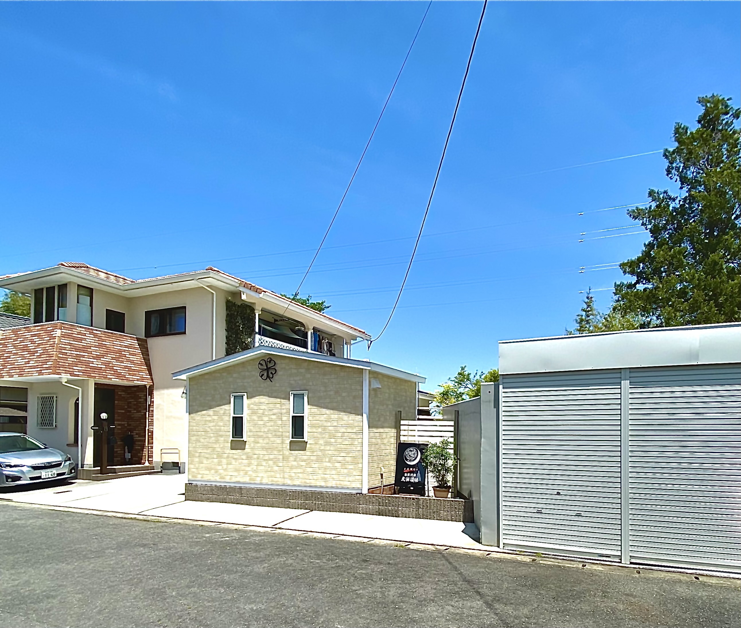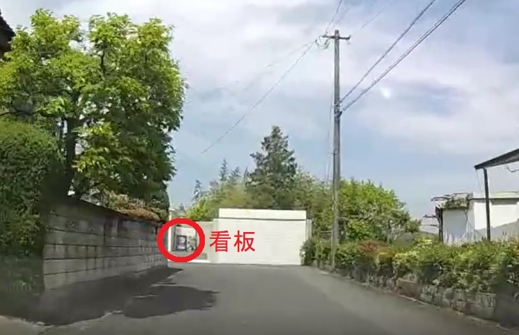 ●突き当りに白いガレージと看板が見える。
